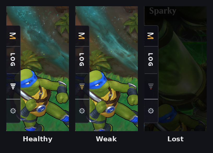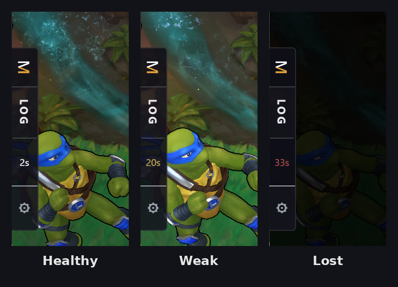 Simple display, layered detail. Four signal bars. Everyone knows what signal bars mean. But my favorite upgrade is the optional latency counter: the raw number of seconds since Arena's last server message. Those are the two pieces of information worth putting on screen.
